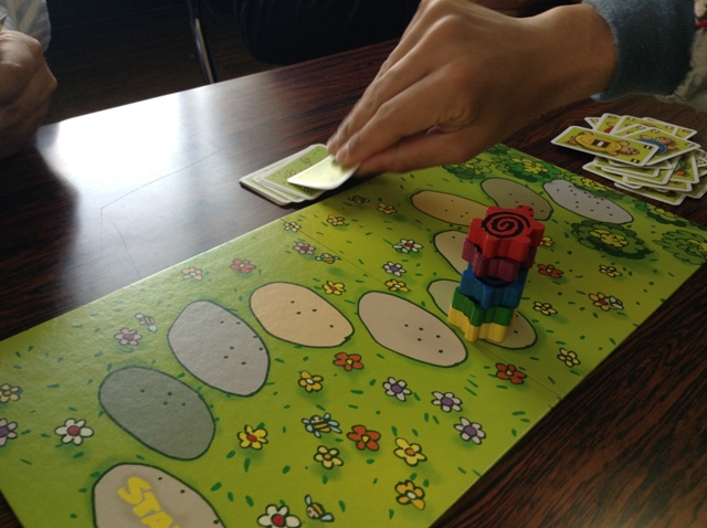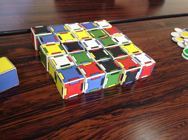 残念ながらタイトルは失念しましたが、ゲームマーケットでベータ版が販売されていたゲームです。色をうまく組み合わせて点数を競います。時間制限があったがよりスリリングかなーと思いました。